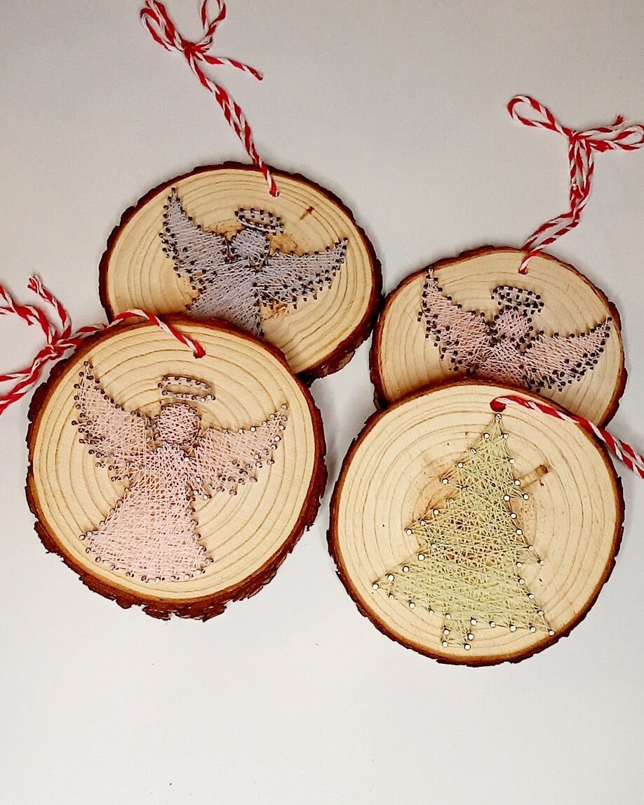 Suspension en rondin avec corde réalisée en string art d'environ 10cm de diamètre (+ ou - 2cm) pour décorer votre sapin, cheminée, table, etc...
